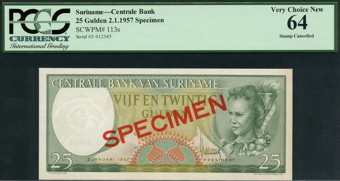 Centrale Bank van Suriname, specimen 25 gulden, 2 January 1957, serial number Z012345, green on multicolour underprint, girl and pile of fruit and torch at right, value at low left and right, red SPECIMEN overprint