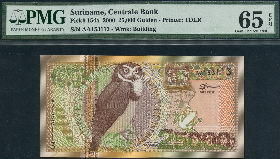 Centrale Bank van Suriname, 25000 gulden, 1 January 2000, serial number AA153113, brown and multicolour, Specktacled Owl at centre, arms at top right, value at low right