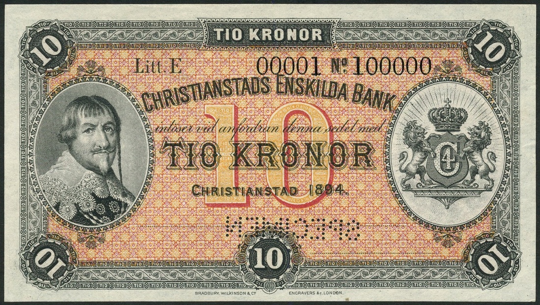 (†) Chritianstads Enskilda Bank, specimen 10 kronor, 1894, serial number 00001-100000, pink and orange, King Carl Gustav at left, arms at right, reverse pink and orange, medallic female head at centre, value at left and right