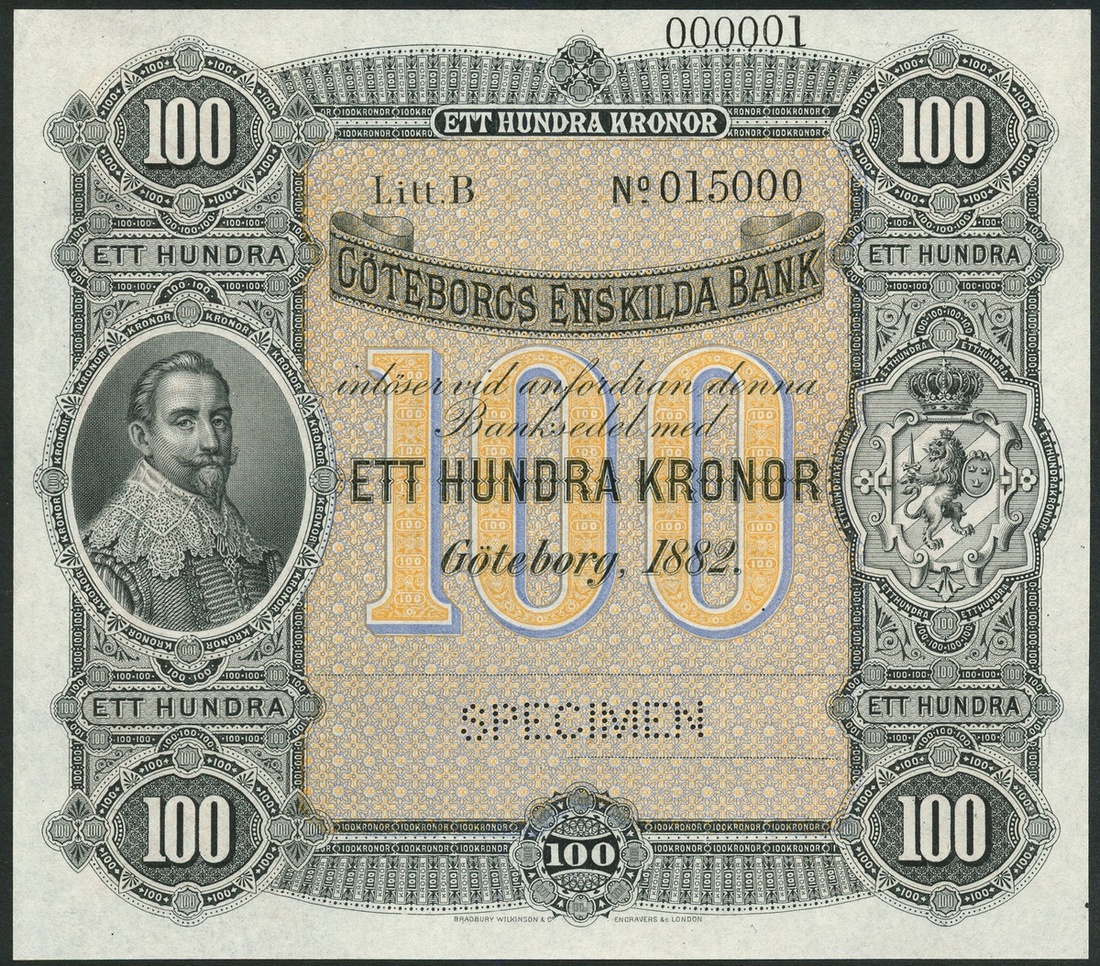 (†) Goteborgs Enskilda Bank, specimen 100 kronor, Goteborg, 1882, 000001- 015000, black, blue and pale yellow, King Gustav II Adolf at left, arms at right, reverse orange and blue, medallic female head at left and right