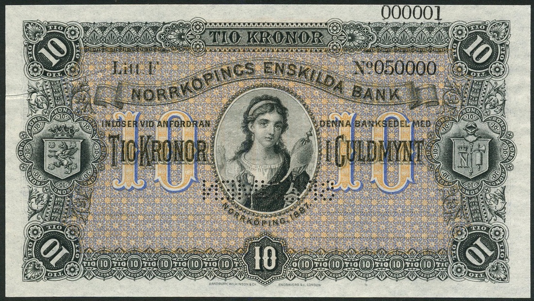 (†) Norkoppings Enskilda Bank, specimen 10 kronor (2), 1887, black, blue and orange, maiden spinning at centre, reverse blue and orange, medallic female head at left and right