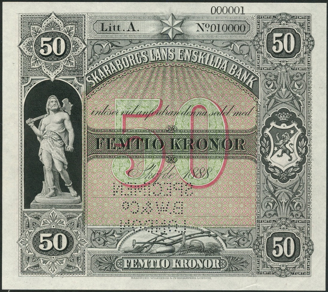 (†) Skaraborgs Lans Enskilda Bank, printer's archival specimen 50 Kronor, 1888, Litt A, 000001-010000, black on carmine pink and pale green underprint, statue of standing man with axe at left, arms at right, plough at lower centre, reverse carmine pink and green, arms at centre, specimen 10 kronor, 1888