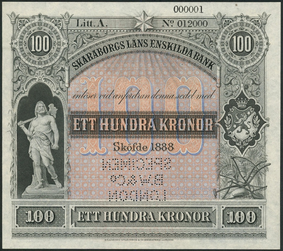 (†) Skaraborgs Lans Enskilda Bank, printer's archival specimen 100 Kronor, 1888, Litt A, serial number 000001-012000, black on pink and blue underprint, statue of standing man with axe at left, arms at right, sheaf, sickle and plough lower right, reverse blue and pink, arms at centre, value at left and right