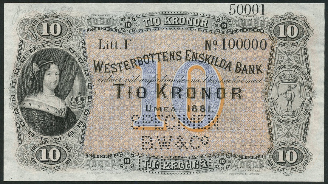 (†) Westerbottens Enskilda Bank, printer's archival specimen 10 Kronor, Umea 1881, Litt. J, serial run 50001 to 100000, black on blue and orange underprint, portrait of Queen Christina at left, arms at right, reverse orange and blue, crowned female head at centre, value at right and left
