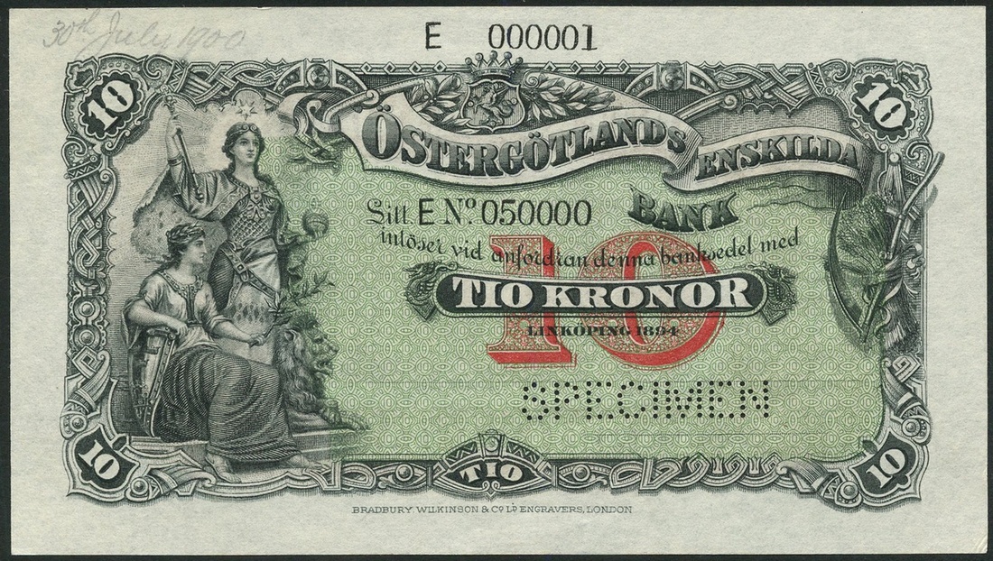 (†) Ostergotlands Enskilda Bank, printer's archival specimen 10 Kronor, 1894, serial number run E 000001-E 050001, black and red on green underprint, crowned arms at top centre, two women at left, value in each corner, reverse brown, man ploughing with two horses