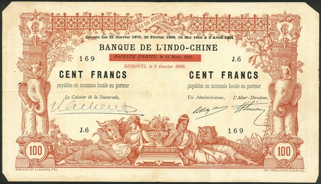 Banque de l'Indo-Chine, Tahiti, 100 francs, 2 January 1920, serial number J.6 169, brown and white, allegorical maidens low centre, elephant and column at left and right, red 'PAPEETE (TAHITI) le 11 Mars 1914' overprint and red DJIBOUTI, le 2 Janvier 1920 below, d'Oissell and Simon signatures and an additional manuscript signature at left reverse text, also 100 francs (2), ND (1939-), brown, green and white, maiden with wreath at centre