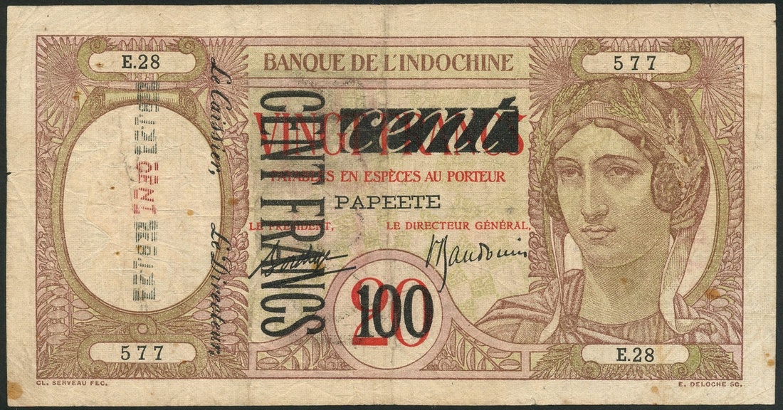 Banque de l'Indo-Chine, Tahiti, 100 francs overprint on 20 francs, ND (1940), serial number E.28 577, lilac and green and white, Ceres at right, Borduge and Baudouin signatures, black CENT FRANCS vertically at left, CENT at top centre and CENT in red at left, reverse lilac, peacock at left, red PAPEETE at left, black 100 FR at centre
