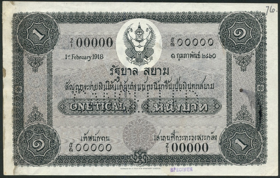 (†) Government of Siam, specimen 1 tical, 1 February 1918, serial number Z/1 00000, uniface, black on grey-green underprint, arms at top centre, value at each corner