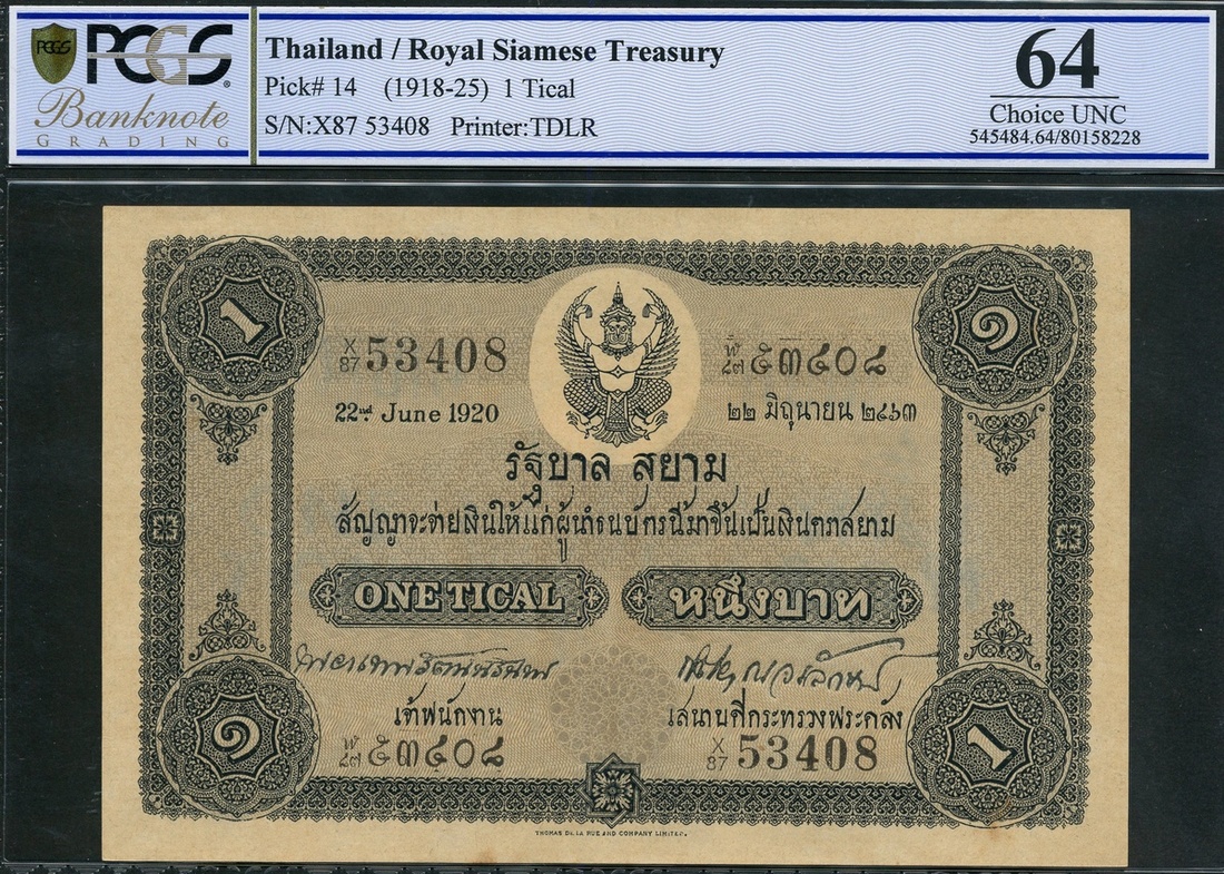Government of Siam, 1 tical, 22 June 1920, serial number X87 53408, uniface, black on pale blue, Garuda at top centre, value at centre and corners