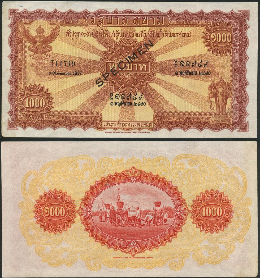 (†) Government of Siam, specimen 1000 ticals, 1 November 1927, serial number T/1 11749, red and yellow, Garuda bird top left, three headed elephant low right, value low left and top right, reverse red and pale orange-yellow, ceremonial procession at centre