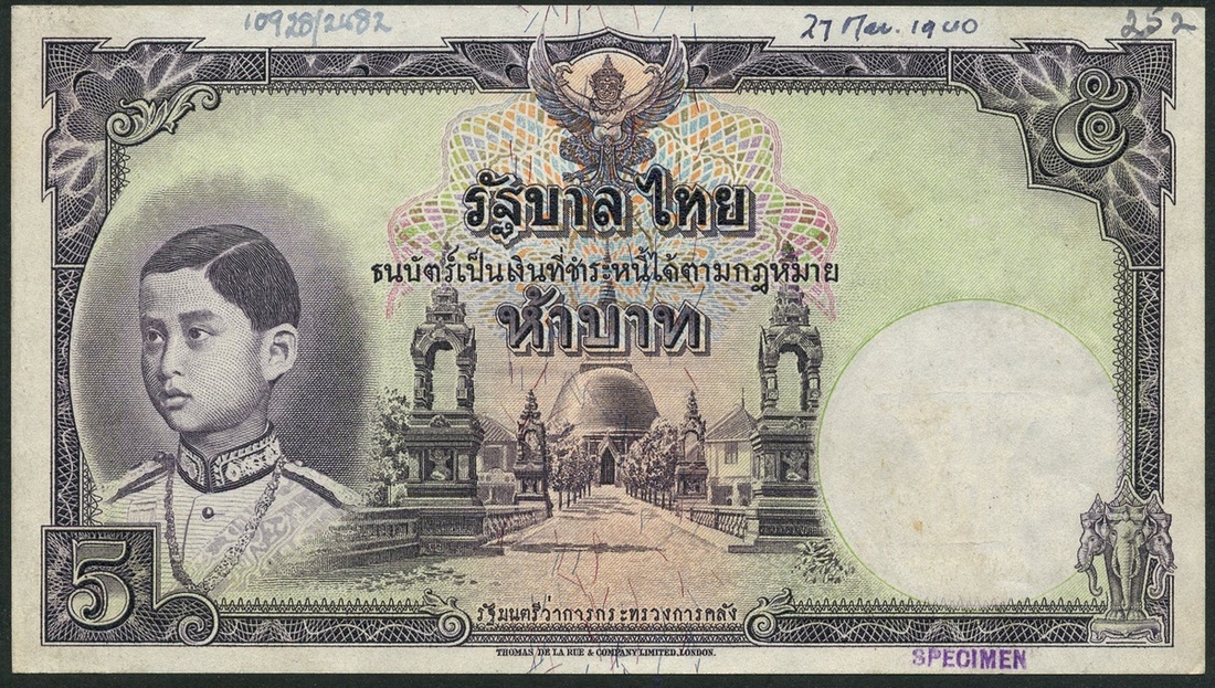 (†) Government of Siam, specimen 5 baht, ND (1940), no serial numbers, purple and pale green, Rama VIII as a boy at left, also a specimen 1 baht, ND (1940), red serial number D/51 00000, blue and pale green,