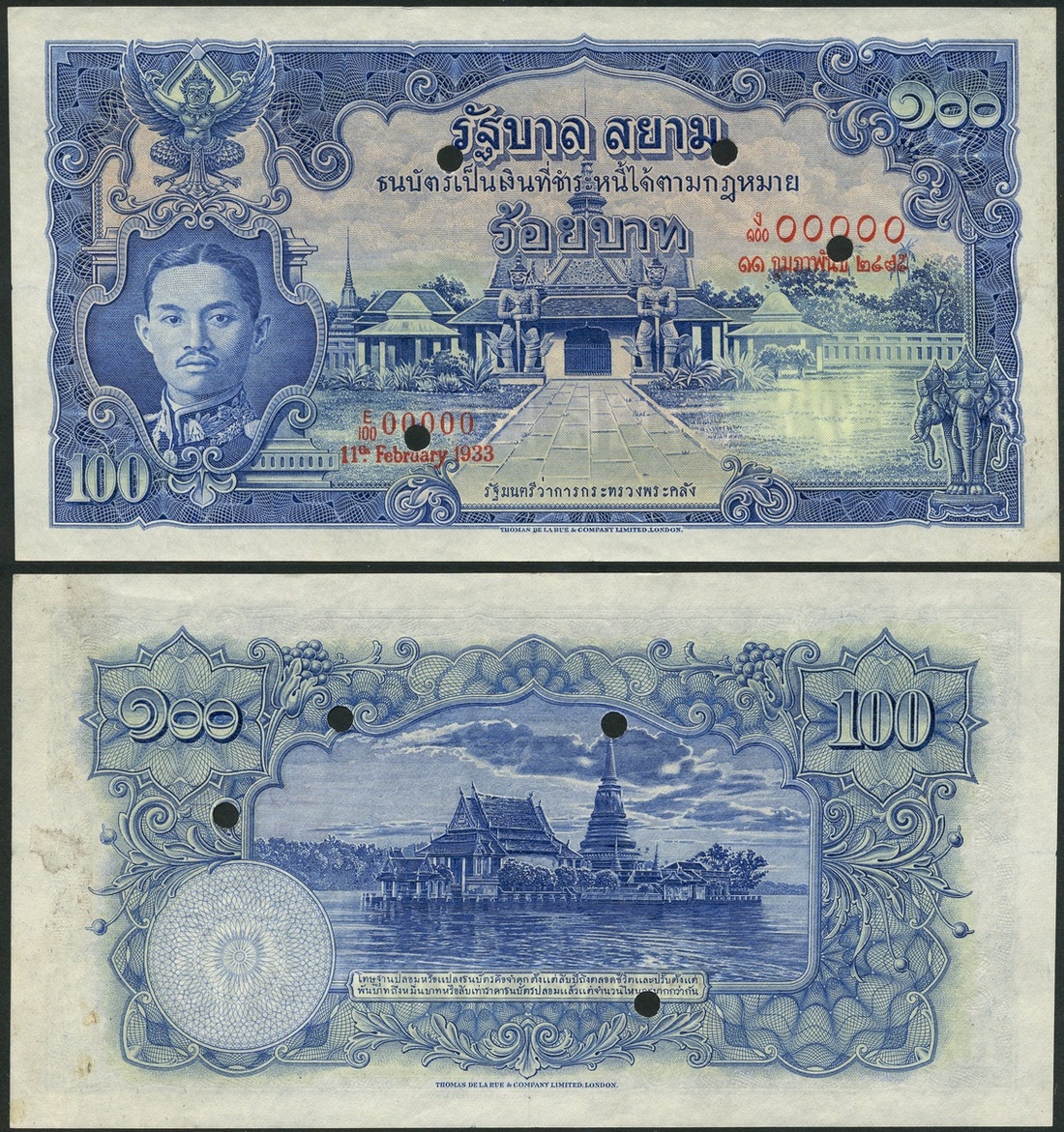 (†) Government of Siam, specimen/trial 100 baht, 11 February 1933, red serial number E/100 00000, blue and pale pink and pale green, Rama VII at left, Garuda bird above, pagoda at centre, three headed elephant low right, reverse blue, pagoda and island at centre, value top left and right