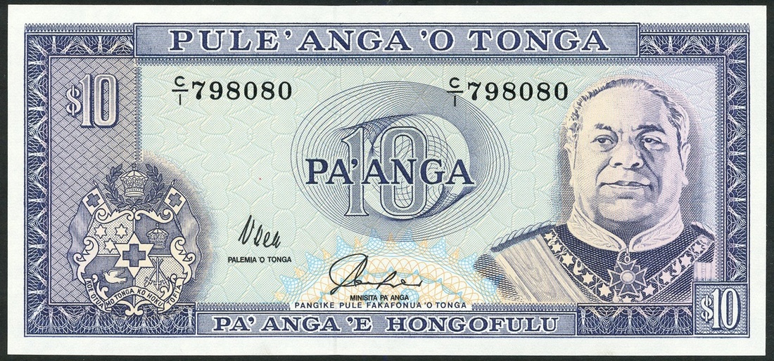 (x) National Reserve Bank of Tonga, consecutive, 10 pa'anga, ND (1992), serial number C/1 798080-9, blue on multicolour, Salote III at right, arms at lower left