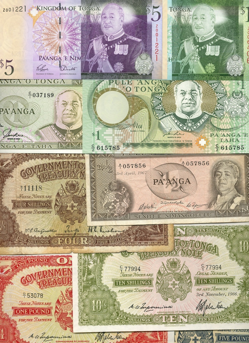 Tonga, a group of notes as follows: 4 shillings, 10 shillings, £1 and £5, all 1966, brown, green, red and blue respectively, all, arms at centre flanked by value in tablets, palm trees at left and right, reverses, geometric pattern, value in each corner, together with an additional 20 notes