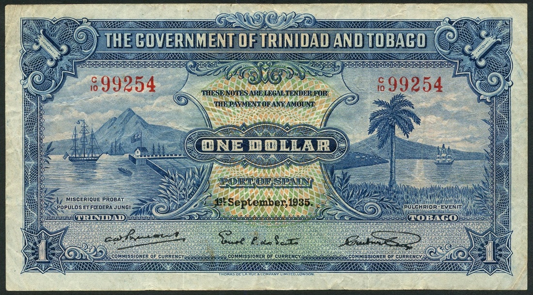 (x) Government of Trinidad and Tobago, $1, 1 September 1935, red serial number C/10 99254, blue, sailing ship in harbour at left, sailing ship and palm tree at right, value at centre and corners, reverse blue and tan, arms at centre, value at left and right