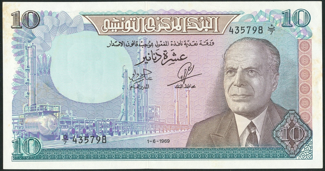 Banque Centrale de Tunisie, 10 dinars (11), 1 June 1969, pale blue-green, President Bourguiba at right, oil refinery at left centre