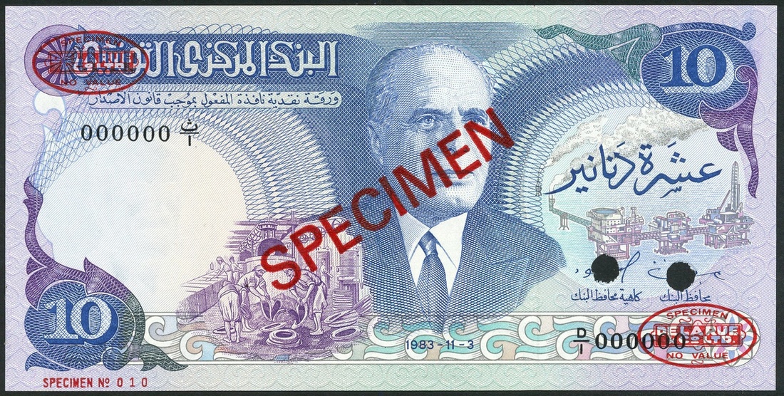 (†) Banque Centrale de Tunisie, a group of specimens comprising 1/2 dinar (2), 1972, 1973, Bourguiba at left, 1 dinar (2), 1972, 1973, Bourguiba at right, specimen 5 dinars (2), 1972, 1973, 65, also 10 dinars (2), 1973, 1983, all Bouguiba at right