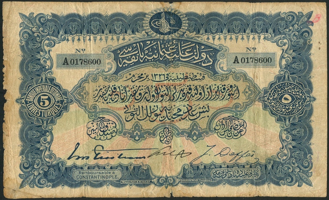 (x) Banque Imperiale Ottomane, 5 livres, AH1326 (1909), serial number A0178600, blue on red and green underprint, Toughra of Muhammad V at top centre, value at left and right