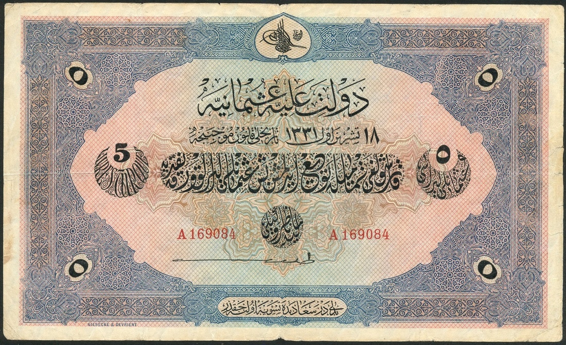 (x) State Notes of the Ministry of Finance, 1/4, 1/2 and 5 livres, AH1331 (1915-16), series E and D and serial number A169084, black on green, black on red and black on blue and multicolour respectively