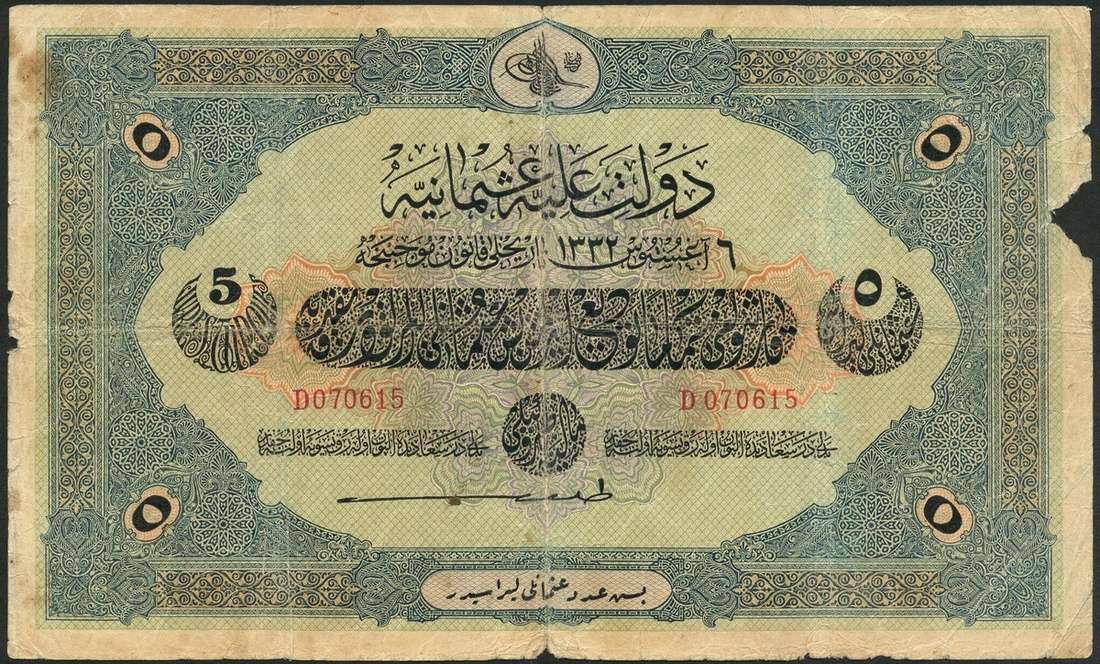 (x) State Notes of the Ministry of Finance, 1 and 2 1/2 piastres, AH1332 (1916-17), and 5 piastres (2), 20 piastres, 1 livre (3), and 5 livres, AH1332 (1916-17), green, red, olive, orange, green and blue respectively
