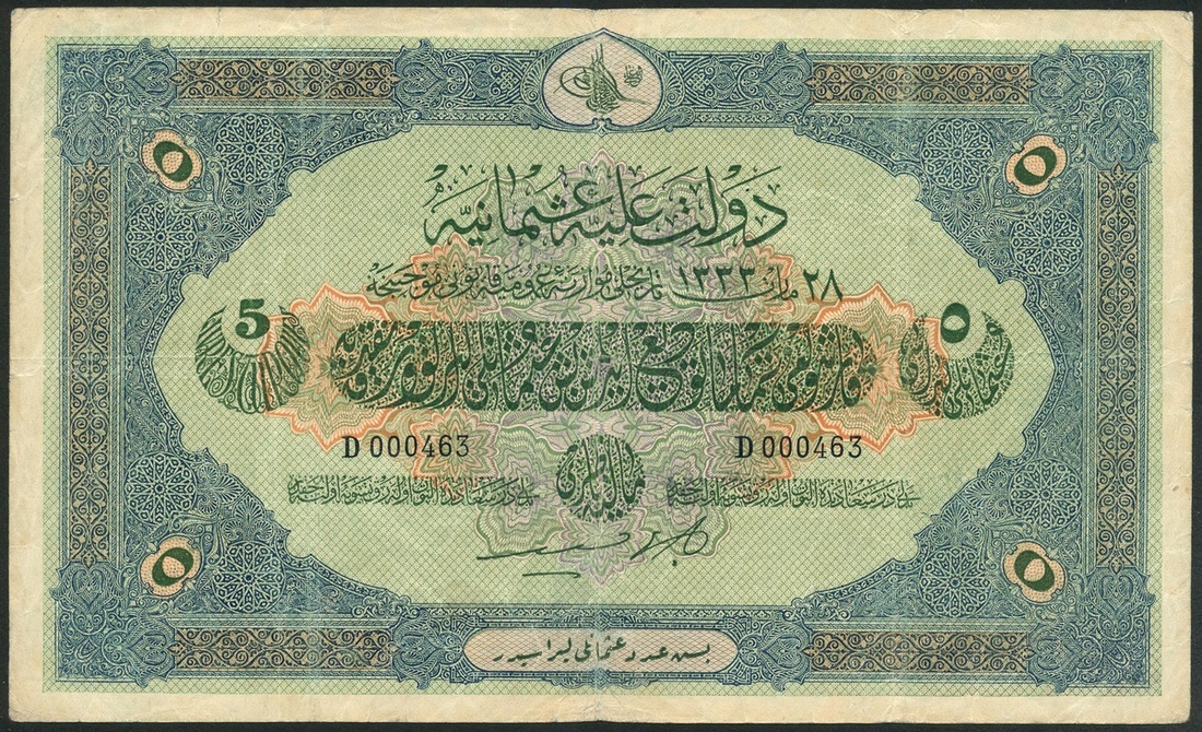 (x) State Notes of the Ministry of Finance, 5 livres, 28 March AH1333 (1917), serial number D000463, black and blue on red and green underprint, value at left, right and corners
