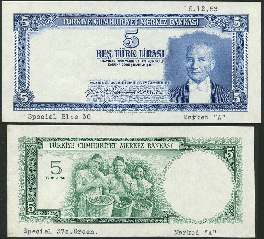 Central Bank of Turkey, obverse and reverse die proofs for 5 turk lirasi, c.1953, obverse blue, Ataturk at right, value at centre and each corner, reverse green, three women with baskets at centre