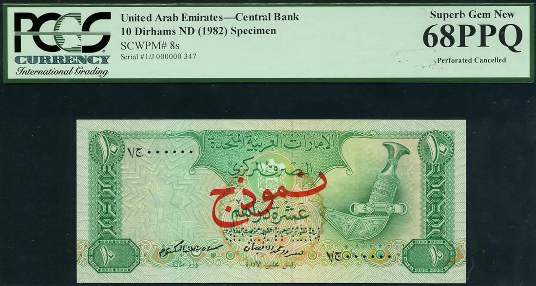 (x) United Arab Emirates Central Bank, specimen 10 dirhams, ND (1982), serial number 1/J 000000, green on multicolour underprint, Khanjar at right, overprinted SPECIMEN in Arabic on obverse, English on reverse