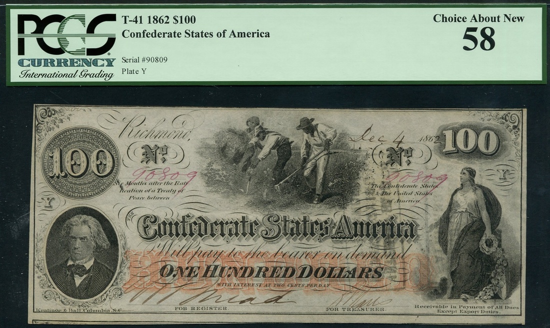 aConfederate States of America, consecutive $100 (5), 186[2], plate Y, serial number 90808-90812 black print, value in orange text low centre, value top left and right, portrait of Calhoun at low left, men picking cotton top centre, Columbia at low right, manuscript signatures