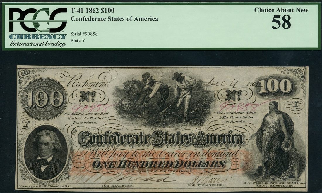 Confederate States of America, consecutive $100 (3), 186[2], plate Y, serial number 90857-90859, black print, value in orange text low centre, value top left and right, portrait of Calhoun at low left, men picking cotton top centre, Columbia at low right, manuscript signatures