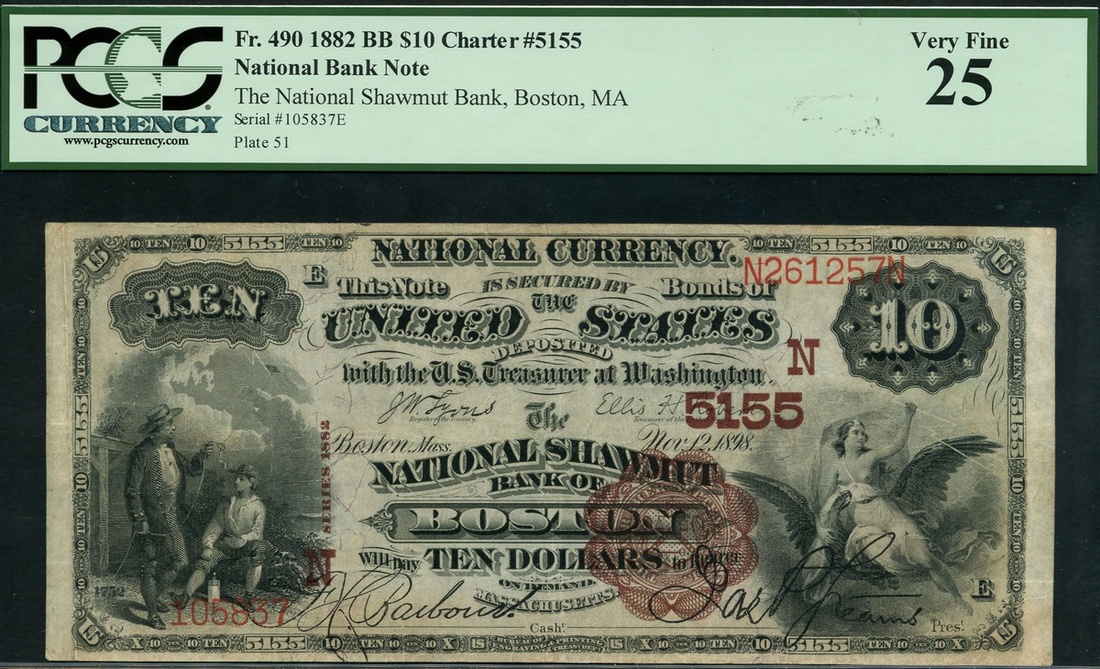 National Currency, USA, $10, National Shawmit Bank of Boston, 12 November 1898, red serial number N261257N, black and white, Benjamin Franklin and kite at left, Liberty and eagle at right, large brown seal in field low right, brown SERIES 1882 and N5155 in field, signatures of Lyons and Roberts at centre, two manuscript signatures below, reverse brown