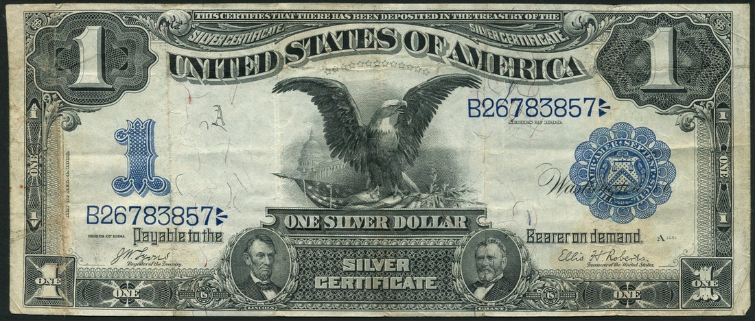 U.S.A., silver certificate, $1, series of 1899, blue serial number B26783857, black and white, blue 1 and seal, Lyons and Roberts signatures