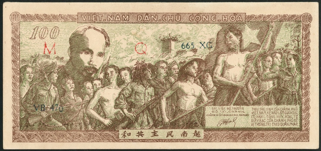 National Bank of Vietnam, 1 dong (33), ND (1956), prefix B.6, green and lilac, temple at right , also Vietnamese Banknote, 5 dong (2), ND (1946), olive brown, factory worker at left, also 100 dong, ND (1951), brown and green, Ho Chi Minh at left