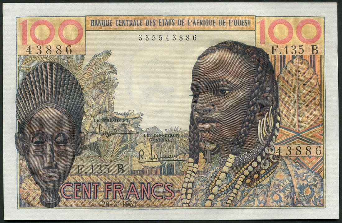 Banque Centrale des Etats de l'Afrique de l'Ouest, French West African States, 100 francs (13), 2 March 1965, all prefix J.225B (Benin), multicoloured, mask at left, girl at right, also 100 francs (9), 20 March 1961, prefix F.135 B (Benin)