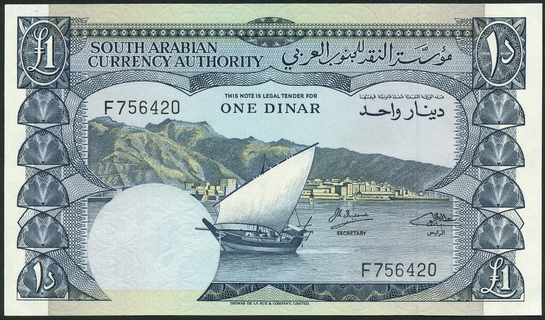 South Arabian Currency Authority, 1 dinar (10), ND (1965), prefix F, blue and pale green, felucca at centre, Ireland and Ali Bazara signatures