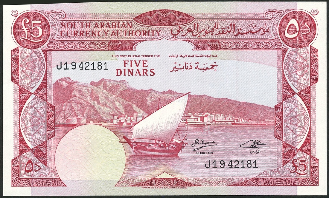 South Arabian Currency Authority, 5 dinars (10), ND (1965), prefix P, pink and pale blue, felucca at centre, Ireland and Ali Bazara signatures