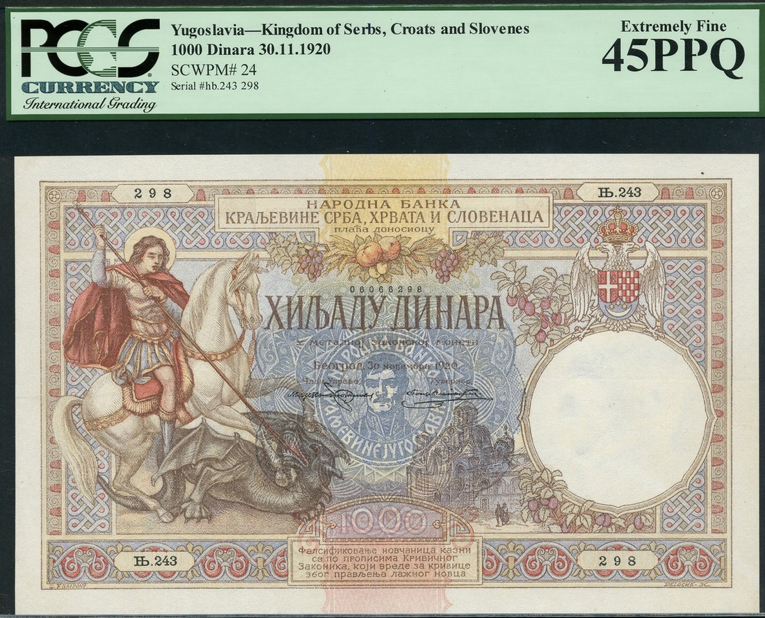 National Bank of the Kingdom of Yugoslavia, 1000 dinara, 30 November 1920, serial number 243 298, multicoloured, St George slaying dragon at left, church at centre right, arms at top right, blue seal with head of Karageorge at centre, reverse, farmer and ox team at centre, city views