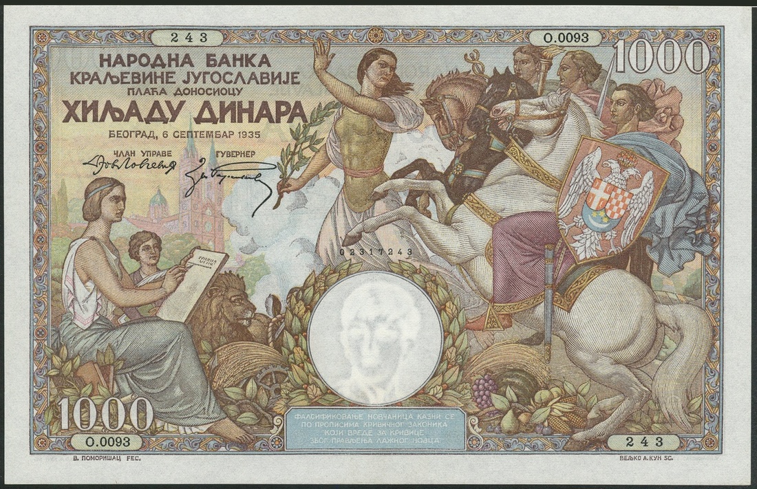 (x) National Bank of the Kingdom of Yugoslavia, 1000 dinara, 6 September 1935, serial number O.0093 243, multicoloured, male and female allegories along with three horses and a lion, reverse, suspension bridge and two male allegories, also 100 dinara (2), 1931 and 100 dinara, 1934