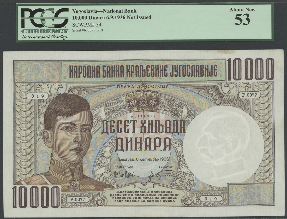 National Bank of the Kingdom of Yugoslavia, 10000 dinara, 6 September 1936, serial number P.0077-319, brown and multicoloured, King Peter II at left, arms at centre, value at centre, low left and top right, reverse brown and multicoloured, allegorical farming couple at right