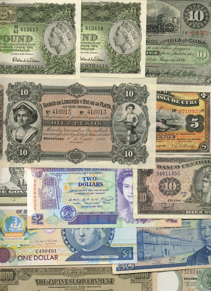 A group of world notes including Uruguay, Cuba (6), Mexico (2), Ecuador (2), Brazil (8), Bolivia, Peru (4), Colombia, Paraguay (2), Chile, Argentina, Guyana, Nicaragua, Belize (3), Equatorial Africa, USA (3), complete set of Japanese Government (Malaya), Commonwealth of Australia, consecutive £1 (2), serial number HC/63 610617-8 (uncirculated)