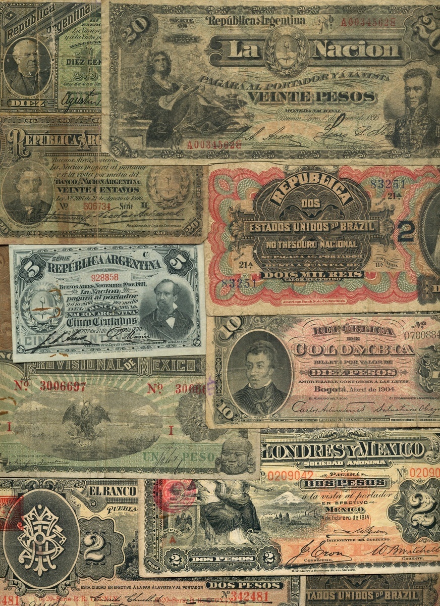 A group of South American notes comprising Republica Argentina, 5 centavos, 1891, black print, 10 centavos 1883, 20 centavos, 1890, serial number 305734, 20 pesos, 1895 (Pick 6, 209, 211, 222, Republica dos Estados Unidos do Brazil, 2 mil reis, 1900, 1918 (2) (Pick 11, 13), Republica Colombia, 10 pesos, 1904 (Pick 312), El Banco Oriental de Mexico, 2 pesos, 1914, Londres Y Mexico, 2 pesos, 1914, Provisional de Mexico, 1 pesos, 1916,