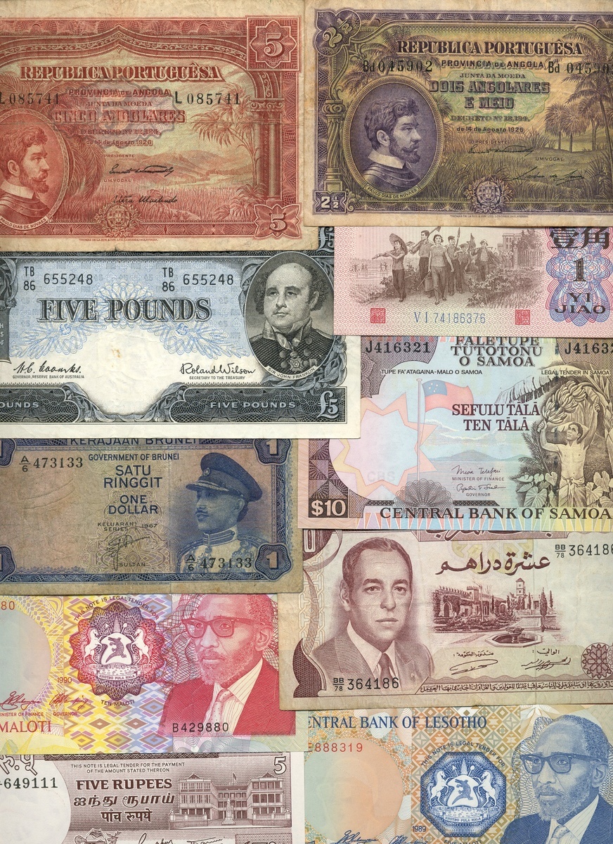 (x) Mixed world notes, comprising, Singapore (3), Brunei (7), Vanuatu (1), Gibraltar (1), Samoa (5), Australia (1), Dominica (4), Tonga (1), Cape Verde (1), Mauritius (1), Lesotho (2), Morocco (3), China (4), Angola (2), Brunei (1)