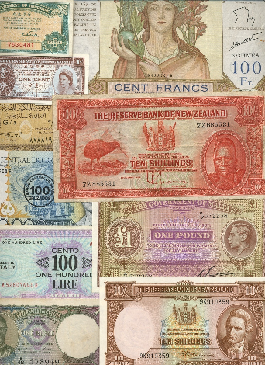 World currency, a mixed lot comprising Egypt 5 piastres, 1940, India 1 rupee, Patel signature, Brazil 100 cruzados, Italian AMC 100 lire, 1943A, Ceylon 5 cents, 1942, 1 rupee, 1944, New Zealand $10 (2), consecutive pair for the 1990 commemorative issue, New Zealand, 10 shillings, 1934, red, Tawhiao at right, 10 shillings (2), Hanna and Fleming signatures, Hong Kong Government, 1 cent (2)5 centre (23) and 10 cents, Brazil, Banco do Cafe, 100 mil reis, 19-, Malta, £1, Cuschieri signature and Banque de l'Indo-Chine 100 francs for Noumea (new Caledonia