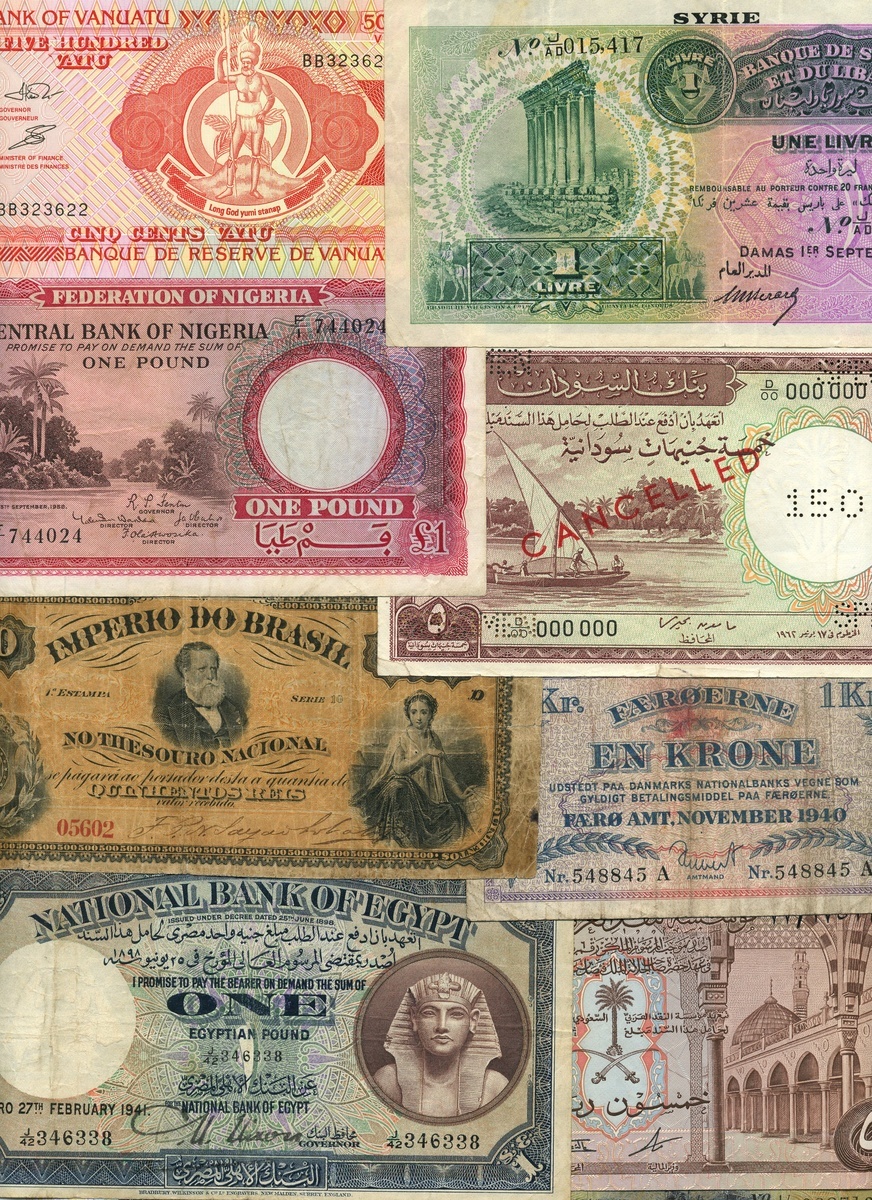 (x) Mixed world notes, including, Syria (1), Vanuatu (1), Nigeria (1), Sudan (1 specimen), Brazil (1), Faroe Islands (1), Saudi Arabia (1), Turkey (1), Egypt (2), British Military Authority (1)