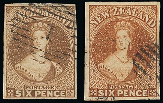 6d. bistre-brown with good margins and clearly cancelled "1", thin spot in one corner, and 6d. pale brown with good margins, fine used. S.G. 12, 14; £800. Photo