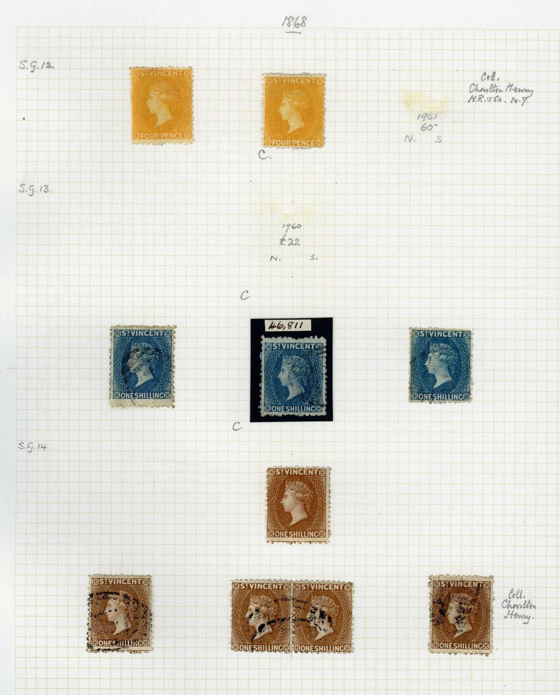 1861-93 mint (generally small part original/unused) and used collection on album leaves; the mint/unused include 1861 no wmk. 1d. (2, one without gum), 1862 no wmk., rough perf 6d. (no gum), 1862-68 no wmk, perf 11 to 12½ 1d. block of four and 4d. (2), and perf 11 to 12½x14 to 16 1/- (2), 1869 no wmk, perf 11 to 12½ 4d. (2, one with short perf at top, the other without gum gum; R.P.S. certificate, 1955) and 1/- brown, 1871 wmk Small Star, rough perf 14 to 16 1d. (2, one without gum), 1872-73 perf about 15 1d. (no gum), 1875-78 perf 11 to 12½ 4d. (no gum; B.P.A. certificate, 1955), 1880 perf 11 to 12½ 6d. (2, one with gum sweated, the other without gum - B.P.A. certificate, 1955), 1/- (no gum; R.P.S. certificate, 1956) and 5/- (no gum), 1881 perf 11 to 12½ 4d. (no gum), 1882-83 CA perf 14 1d., 2½d. on 1d. and 4d. ultramarine (thin spot), 1883-84 CA perf 12 4d. (gum toned), 6d. (2, one with gum toned) and 1/-, and 1885-93 CA perf 14 2½d. on 1d. block of six and 6d. (no gum); the used include 1862 no wmk, rough perf 14 to 16 6d. (3 including a pair), 1862-68 no wmk., perf 11 to 12½ 4d., perf 14 to 14 1/- and perf 11 to 12½x14 to 16 1/-, 1869 perf 11 to 12½ 1/- indigo (3, one with R.P.S. certificate, 1958) and 1/- brown (4 including a pair), 1871 wmk Small Star, rough perf 14 to 16 6d. pair, 1872 perf 11 to 12½ 1/- deep rose-red (R.P.S. certificate, 1955), 1875 perf 11 to 12½ 1/- claret (2), 1875-78 perf 11 to 12½x15 6d. and 1/-, perf 11 to 12½ 4d. (8), 1880 1/-, 1881 perf 11 to 12½ 4d. (2), 1882-83 CA perf 14 4d. ultramarine (3), 1883-84 CA perf 12 4d. ultramarine-blue, 4d. grey-blue and 6d., and 1885-93 CA perf 14 6d. (3, one on small piece) and 5/- block of four on piece. A generally fine lot with some of the used cancelled by abbreviated village datestamps. Cat. £14,500+
