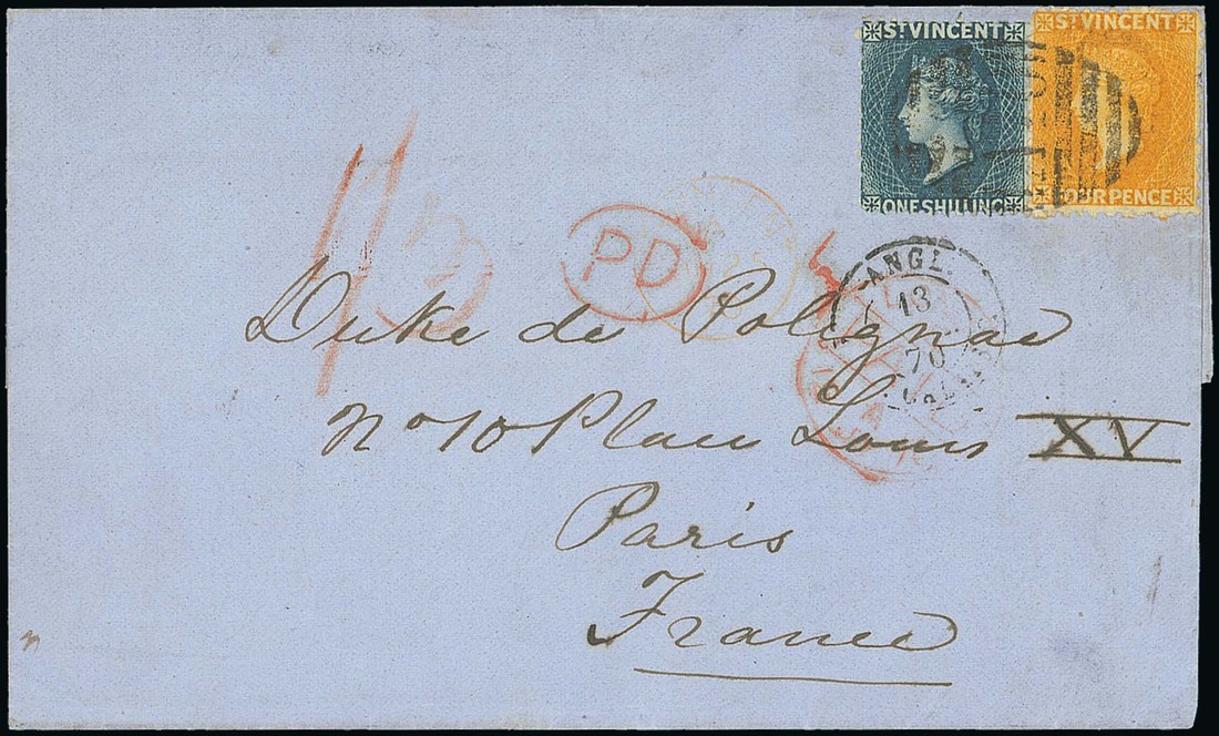 1870 entire ex the "Polignac" correspondence to Paris, bearing 1869 perf 11 to 12½ 4d. yellow and 1/- indigo (perfs slightly trimmed at left and rounded lower left corner) sharing neat "A10" obliterator, showing red crayon "1/3", light despatch c.d.s. overstruck by oval-framed "pd", London Paid transit c.d.s. and Calais entry d.s. with arrival c.d.s. on reverse. A neat, clean and most attractive franking. S.G. 12, 13. Photo