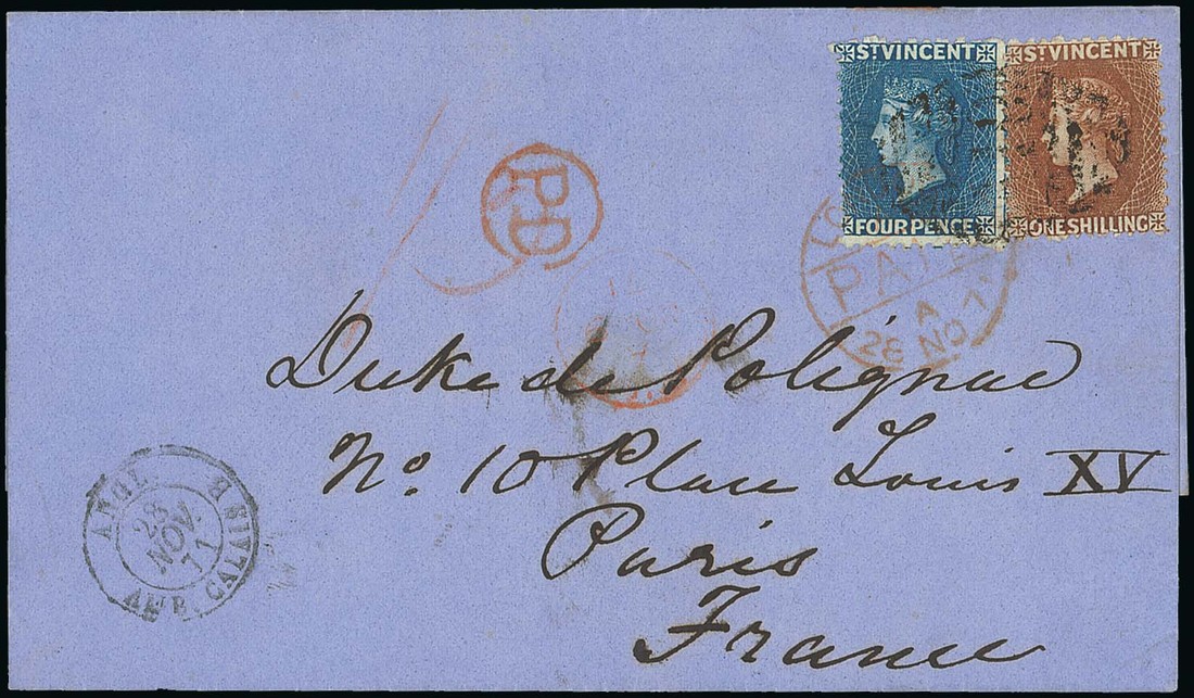 1871 entire ex the "Polignac" correspondence to Paris, bearing 1866 perf 11 to 12½ 4d. blue and 1869 perf 11 to 12½ 1/- brown, both share light "A10" obliterator, showing red crayon "1/3", light despatch c.d.s., circular-framed "pd", London Paid transit c.d.s. (28.11) tying the adhesives, Calais entry d.s. with arrival c.d.s. on reverse. A neat, clean and attractive franking. S.G. 6, 14. Photo