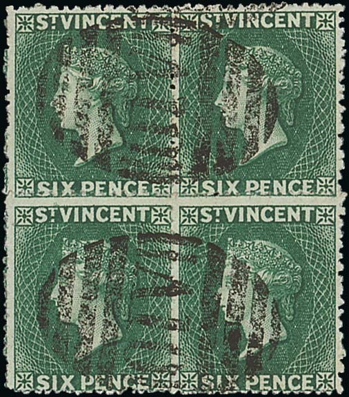 1871 (Apr.) watermark Small Star, rough perf 14 to 16 6d. deep green block of four, twice cancelled by "A10" obliterator. A fine multiple. R.P.S. Certificate (1957). S.G. 16, £280+. Photo