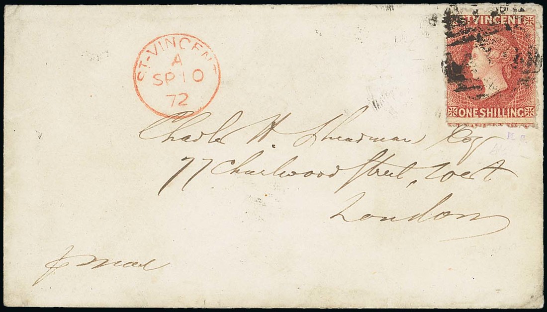 1872 (10 Sept.) envelope to London, bearing 1872 (June) perf 11 to 12½ 1/- deep rose-red, tied by messy "A10" obliterator and showing fine despatch c.d.s. S.G. 17. Photo