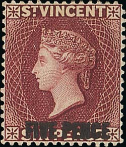 1893 "five pence" on 6d. carmine-lake, variety surcharge double, fine unused with large part original gum. Very rare. S.G. 60c, £7000. Photo